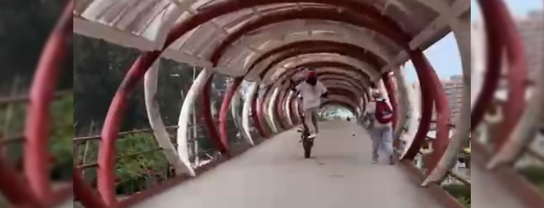 En varios videos que él mismo ha compartido se ve cómo realiza las maniobras en la moto cruzando por el puente que es de uso exclusivo para los peatones. Incluso hace piques a pocos metros de los caminantes.