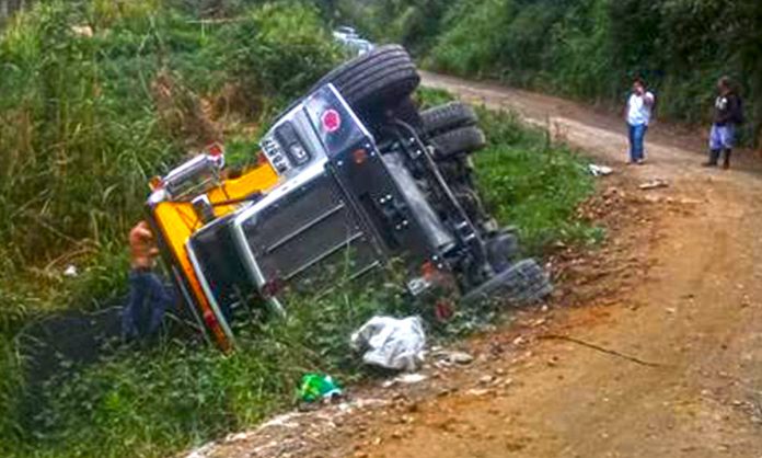 A tan solo dos kilómetros de la Autopista Medellín-Bogotá, en la vía que de El Santuario comunica con el municipio de Granada, una volqueta cargada con material para pavimentación se volcó en la mañana de este martes luego de que la banca de la carretera cediera.