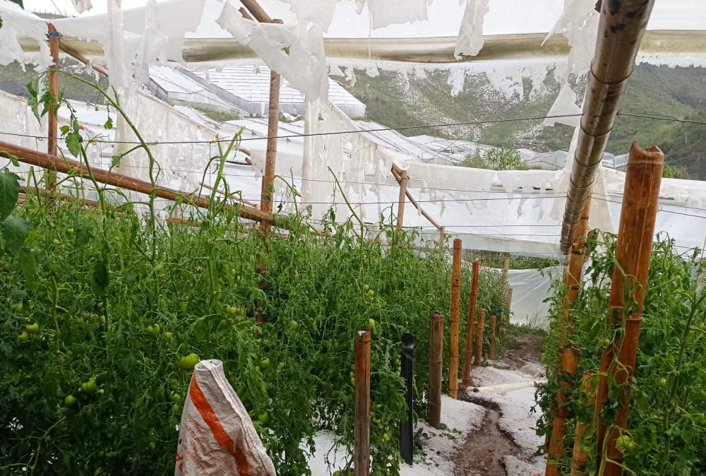 Las lluvias estuvieron acompañadas por fuertes vientos y bolas de granizo que cubrieron los campos de esta localidad. A su paso, la tormenta elevó techos y se llevó parte de los cultivos que se siembran, principalmente, en cinco veredas.