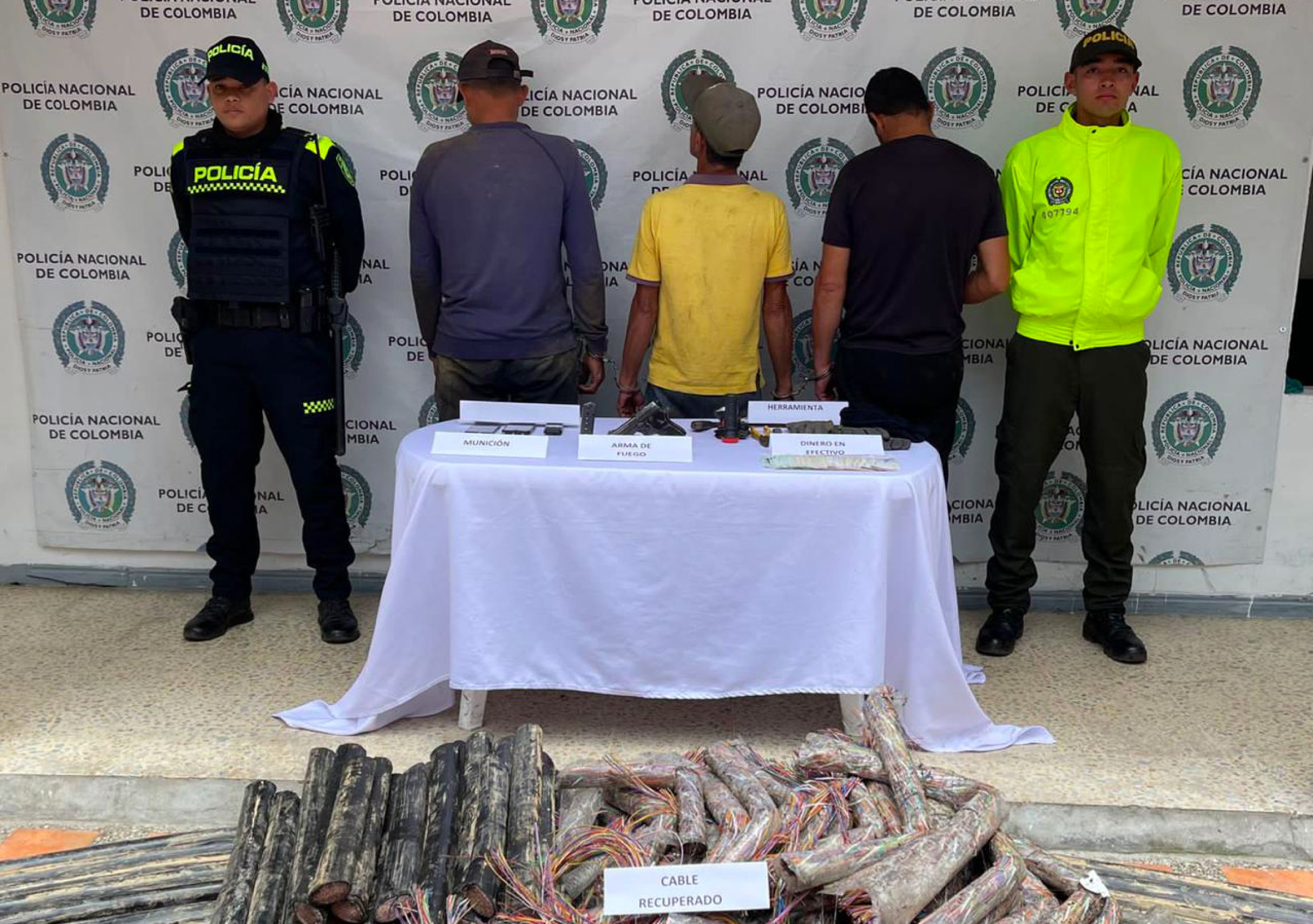 Precisamente, a estos sujetos se les incautó un arma de fuego tipo pistola calibre 9 mm, un proveedor, cinco cartuchos, $5.100.000 en efectivo, dos pasamontañas, herramientas para extraer cable y 600 metros de cable que pertenecían a la empresa de telefonía Tigo, avaluados en $50.000.000.