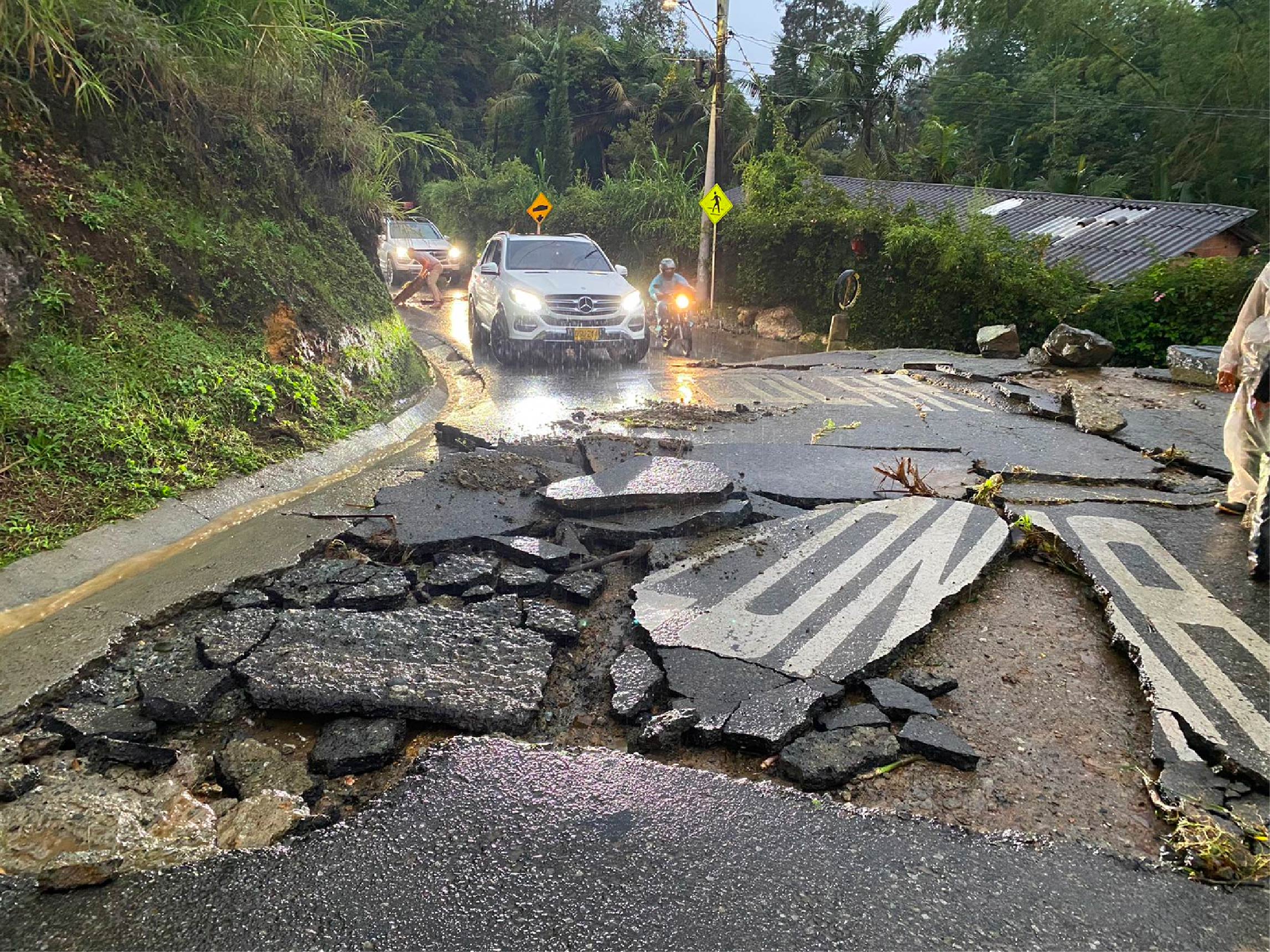 Creciente de una quebrada levantó el asfalto de una vía en Rionegro