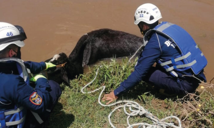 «La comunidad realizó el llamado ya que una vaca estaba metida dentro del río, y como el río estaba crecido por las lluvias, se le dificultaba salir, pero a través de cuerdas y equipos logramos sacar al animalito», manifestó Nelson Vargas, integrante de la Unidad Activa Operativa de Bomberos Rionegro.