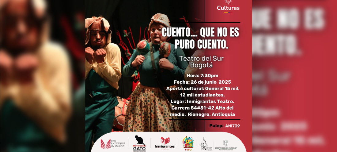 La obra “Cuento… que no es puro cuento”, del Teatro del Sur, de Bogotá, llega en la noche de este 26 de junio a Rionegro, con función en Inmigrantes Teatro, a las 7:30 de la noche.