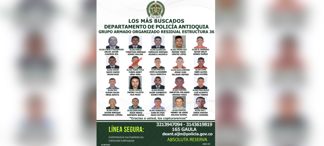 El Departamento de Policía Antioquia publicó un cartel de los más buscados del grupo armado organizado residual (GAOr) Estructura 36, también conocido como frente 36, de las disidencias de las Farc que delinquen en territorio antioqueño.