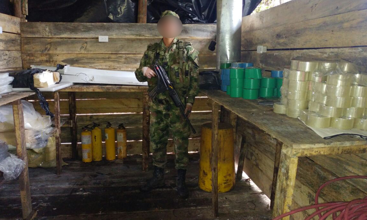 En la zona boscosa había seis construcciones en las que hallaron transformadores de energía, congeladores, compresores, entre otros elementos necesarios para la producción del estupefaciente. Las autoridades puntualizaron que esta localización, “unida a los 124 laboratorios destruidos en lo que va corrido de este año en Antioquia, debilita la capacidad de este grupo armado organizado”.