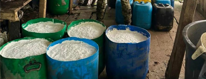 En el lugar se encontraron 327 kilogramos de clorhidrato de cocaína en estado sólido y 619 galones en suspensión, informaron las autoridades, que hallaron igualmente grandes cantidades de insumos químicos: