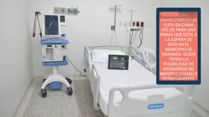 «Solicito amablemente un cupo en cama UCI, es para una prima que está a la espera de esta en el municipio de Granada. Quien tenga la posibilidad de ayudarnos, no importa ciudad o departamento», fue el mensaje transmitido por estados de WhatsApp de una de las personas que han buscado por todos los medios ayudar a su familiar contagiada.