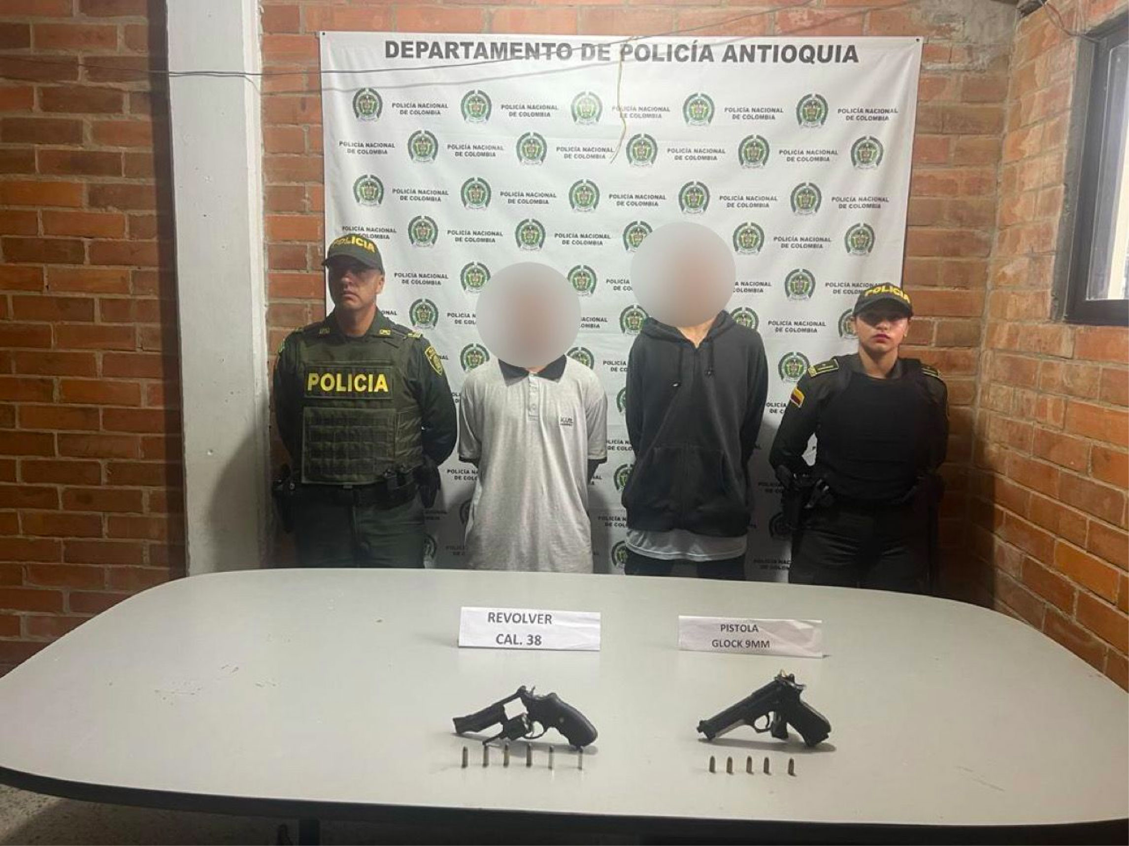 Los capturados son dos jóvenes de 21 y 23 años de edad, a quienes se les incautaron dos armas de fuego: una pistola calibre 9 mm y un revólver calibre 38 largo.