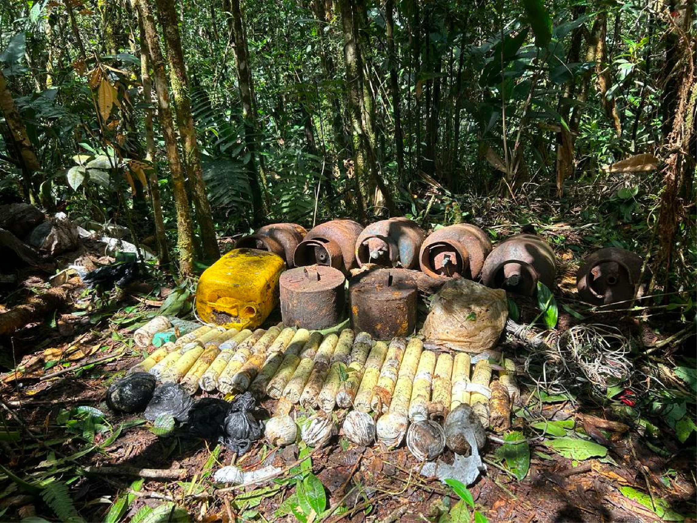Soldados del Grupo de Manejo de Artefactos Explosivos (Marte), de la Séptima División, apoyando al Batallón Especial Energético y Vial de la Cuarta Brigada, atravesaron la espesa vegetación para llegar hasta el depósito ilegal, en el que hallaron ocho contenedores metálicos y uno de plástico, con capacidad de 10 a 30 kilogramos de explosivos; 43 tubos PVC modificados para almacenar 500 gramos de explosivo, 40 metros de cable dúplex y 11 bolsas con 3,5 kilogramos de explosivo.