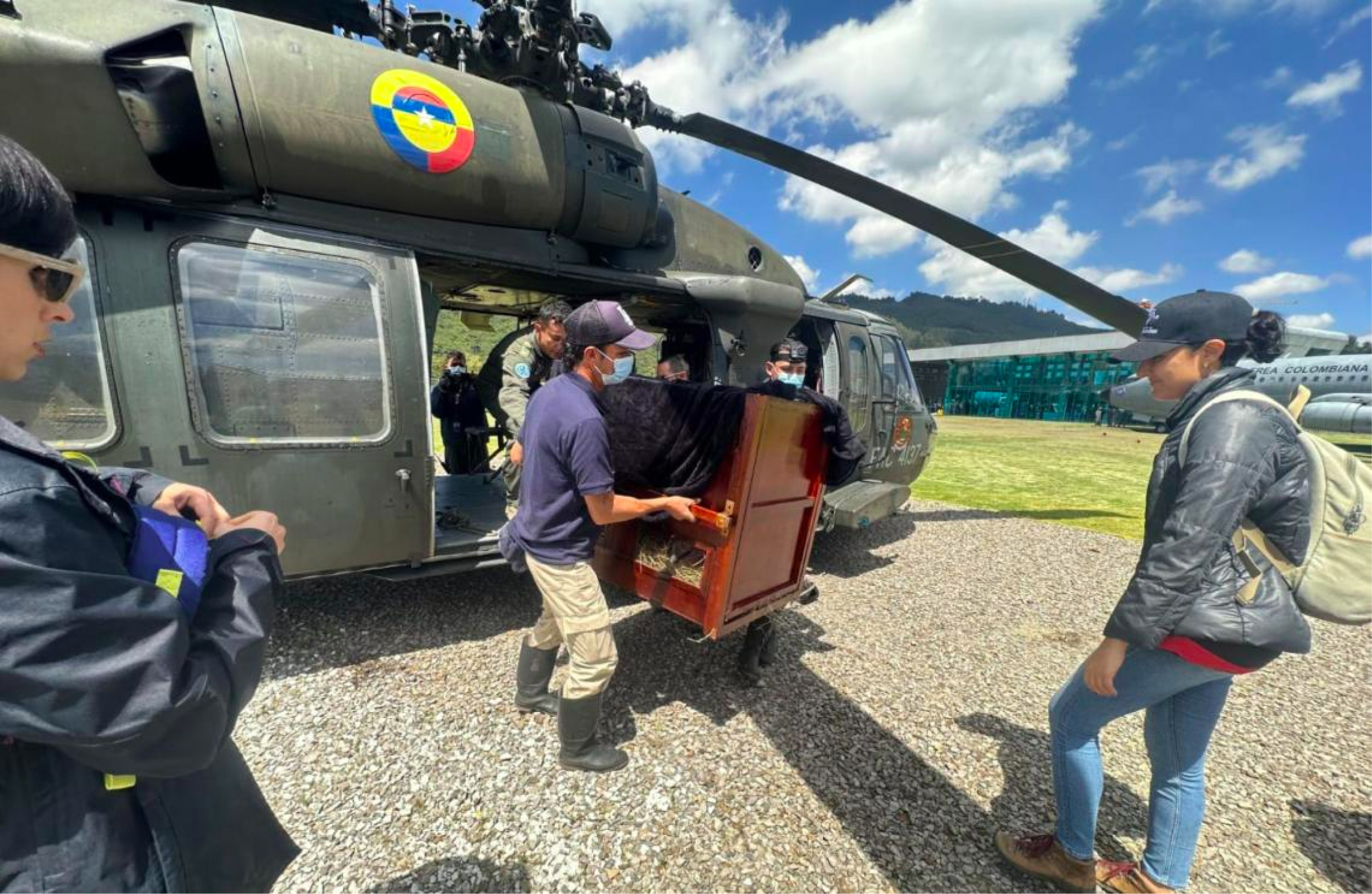 Hasta el aeropuerto Olaya Herrera, que sirve a la capital antioqueña, llegó un helicóptero UH-60 del Comando Aéreo Combate N°. 5, para trasladar al ejemplar, con todas las medidas de seguridad, hasta la Reserva Natural Bioparque Wakatá de la Fundación Parque Jaime Duque, como parte de un proyecto de preservación de esta especie, que se encuentra catalogada en peligro crítico de extinción. Solo en el país, según el más reciente censo realizado en 2021, habitaban alrededor de 63 individuos.