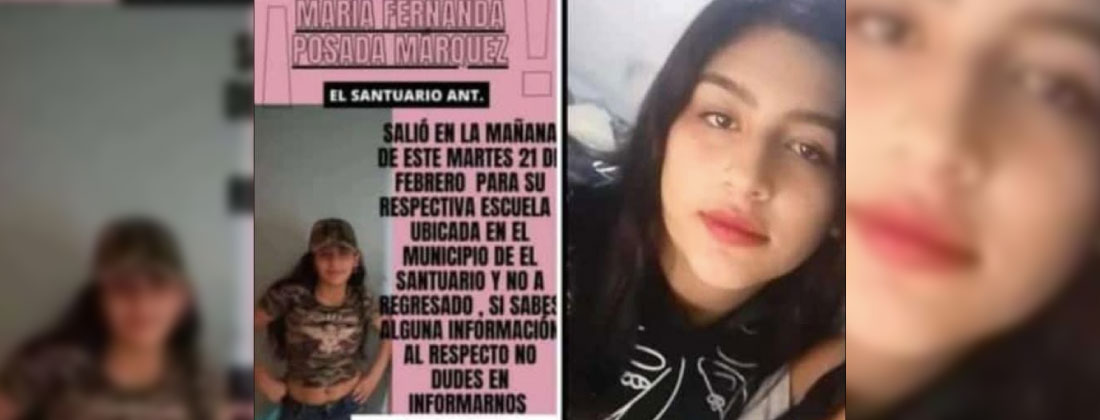 Desde el mediodía del martes 21 de febrero, familiares de María Fernanda Posada Márquez, de 13 años de edad, no saben nada de su paradero. La última vez que la vieron fue al salir de su institución educativa en El Santuario.