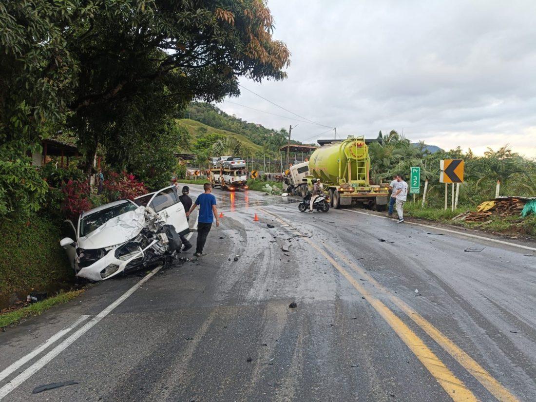 En la mañana de este viernes se registró un aparatoso accidente entre un vehículo de carga y un vehículo particular en la autopista, en inmediaciones de la entrada al municipio de San Francisco.